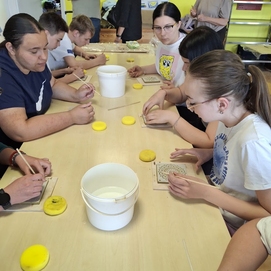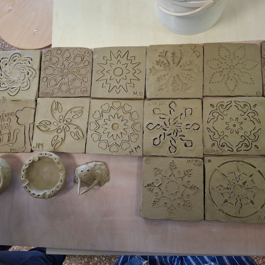 Zatim su pokazali učenicima različite tehnike kako oblikovali glinu. Na glinenim pločicama radili su rezbarije koje će nakon pečenja činiti vrlo zanimljiv mozaik kojim će se ukrasiti neki kutak škole.